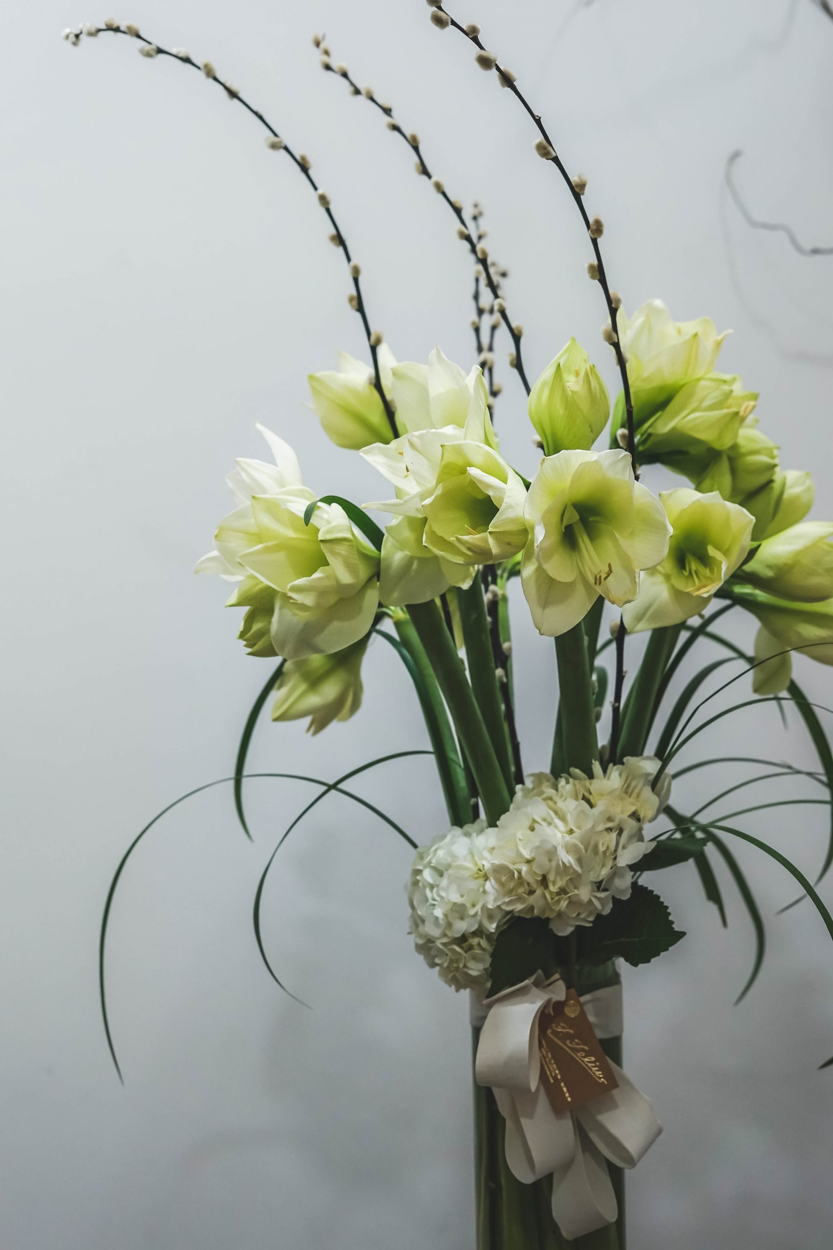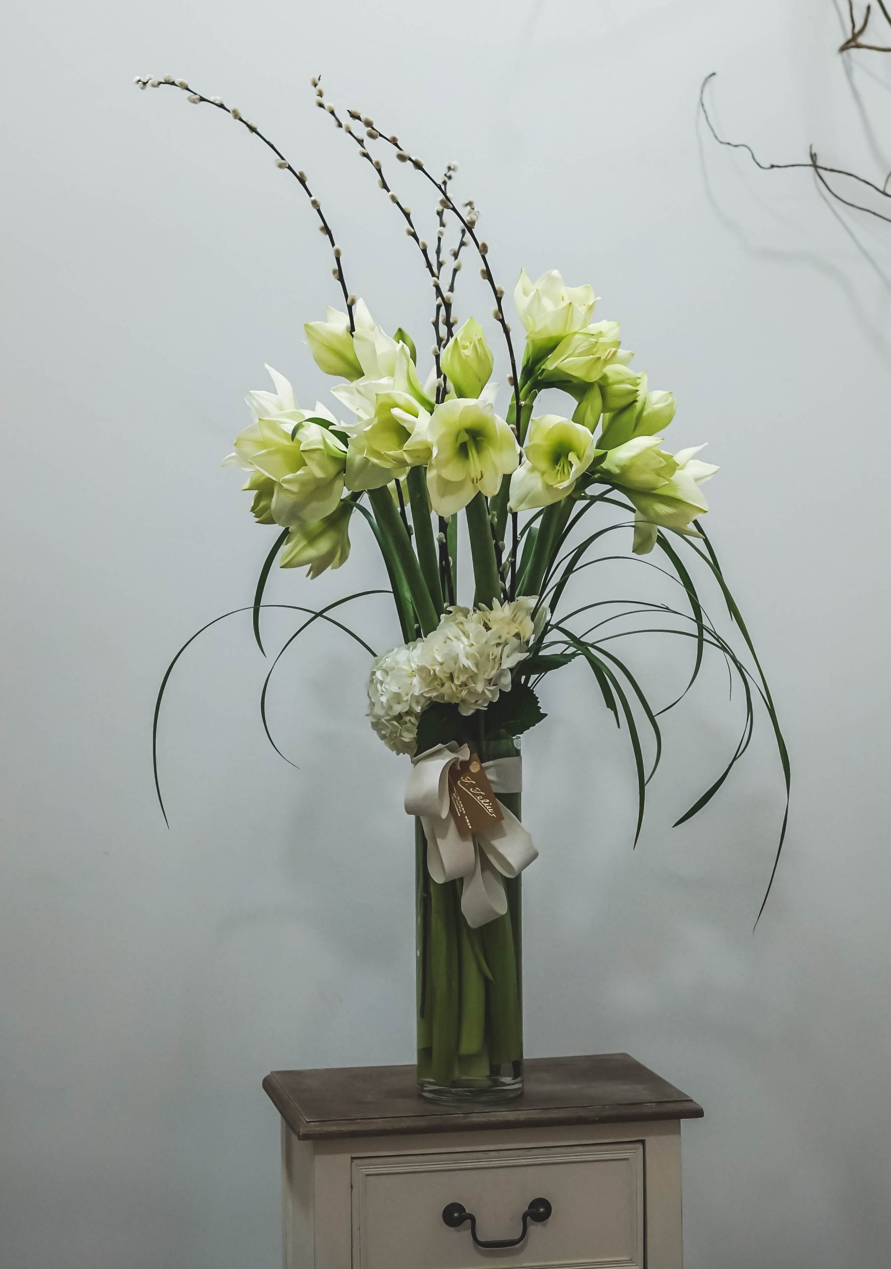 El búcaro de amarilis blancos es una composición que respira elegancia y sofisticación. Los amarilis son unas flores muy apreciadas por su belleza escultural, su gran tamaño y durabilidad. Colocarlos en un búcaro alto es la mejor forma de resaltar su belleza. Esta composición es perfecta para sorprender a alguien en una ocasión muy especial.